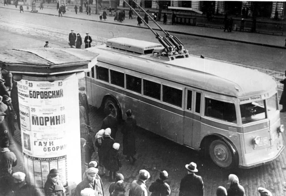 Первый советский троллейбус ЯТБ-1 на московской улице. 1936