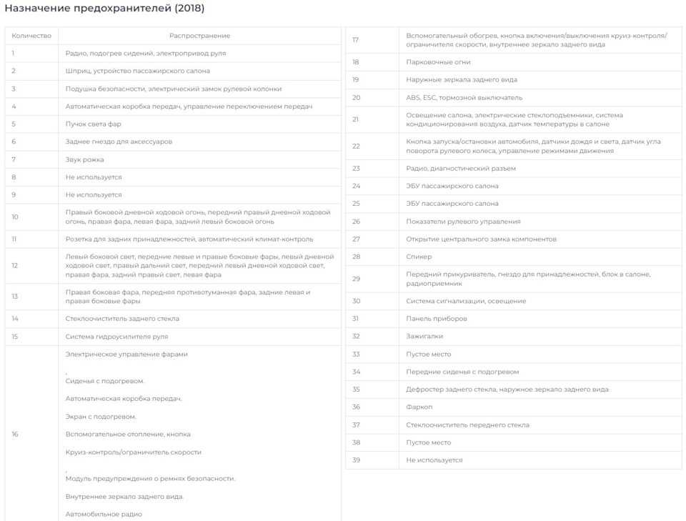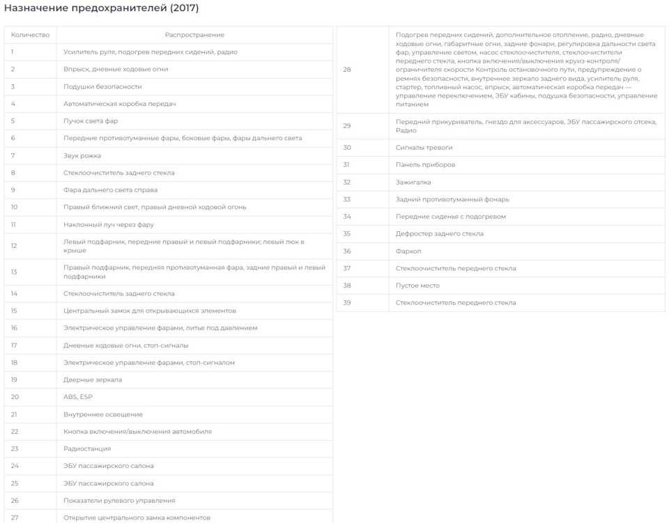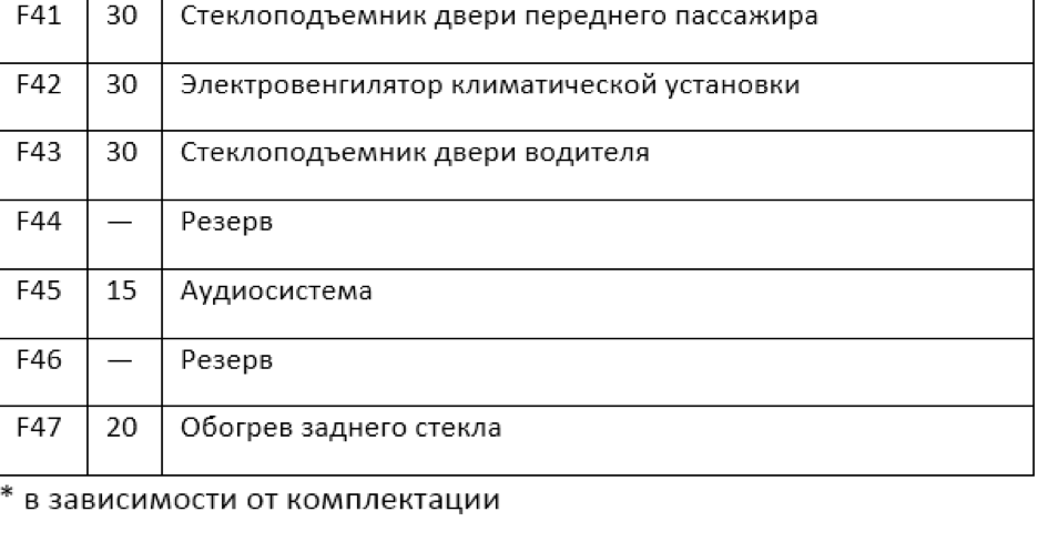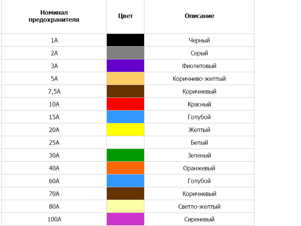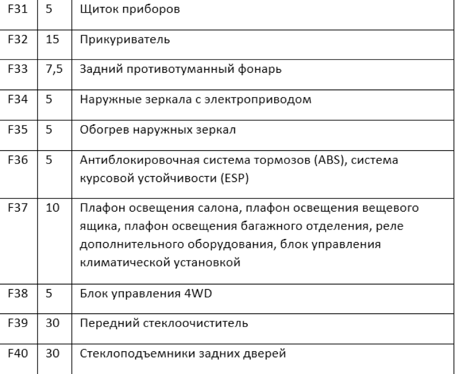 Теперь осталось выяснить какой предохранитель за что отвечает. Для этого воспользуемся таблицей ниже.