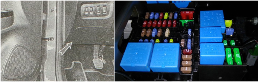 Монтажный блок в салоне автомобиля расположен со стороны водителя в нижней части панели управления. Для доступа необходимо снять защитную крышку.