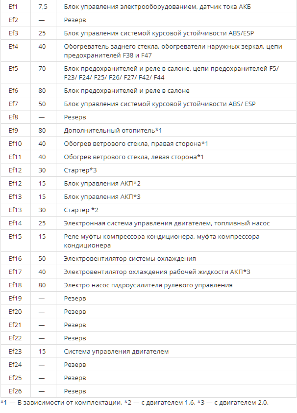 | Ef3 | 30A Обогреватель заднего стекла, обогреватели наружных зеркал |
