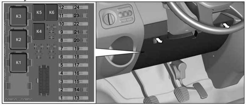 Он находится внизу панели приборов под рулевой колонкой за защитной крышкой.