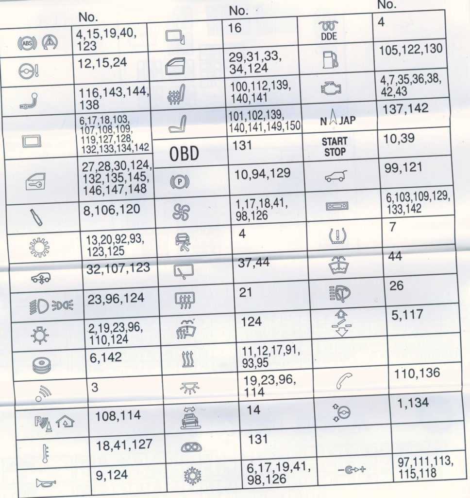 1. 7,5 Левая фара дальнего света 2. 7,5 Правая фара дальнего света 3. 15 Электродвигатель дополнительного вентилятора системы охлаждения двигателя (на малой частоте вращения) 4. 15 Указатели поворота 5. 25(30) Электродвигатели стеклоочистителя, омывателя и фароочистителей 6. 7,53 Лампы стоп-сигнала. Программируемый регулятор скорости движения (круиз-контроль) 7. 15 Звуковые сигналы 8. 25(30)2 Элемент обогрева заднего стекла 9. 7,5(15) Электрооборудование карбюраторных двигателей. или Лампы света заднего хода. (Электрооборудование карбюраторных двигателей. Лампы света заднего хода. Указатель включенной передачи автоматической КПП) 10. 7,5 Контрольные приборы. Бортовой компьютер или Контрольные приборы. Бортовой компьютер. Лампы света заднего хода 11. 15 Электрический топливный насос. Электродвигатель топливо закачивающего насоса 12. 15 Радиоприемник. Бортовая система контроля. Контрольные приборы 13. 7,5 Левая фара ближнего света 14. 7,5 Правая фара ближнего света 15. 7,5 Задние фонари (лампы противотуманного света) 16. 15 Элемент обогрева сиденья водителя 17. 25(30)2 Электропривод люка в крыше 18. 30 Электродвигатель дополнительного вентилятора системы охлаждения двигателя (на рабочей частоте вращения) 19. 15(30)2 Электродвигатель и элемент обогрева наружного зеркала заднего вида 20. 30 Электродвигатель вентилятора отопителя. Система кондиционирования воздуха 21. 7,5 Плафоны освещения салона. Лампа освещения вещевого ящика. Переносная лампа. Часы. Радиоприемник (устройство запоминания станций). Бортовой компьютер 22. 7,5 Лампы габаритного света в левой фаре, левом заднем фонаре 23. 7,5 Лампы габаритного света в правой фаре, правом заднем фонаре. Лампы освещения приборов. Фонари освещения номерного знака 24. 15 Указатели поворота в режиме аварийной сигнализации 25. Резервный 26. Резервный 27. 25-30 Система блокировки замков. Элементы обогрева замков дверей. Противоугонная система Система блокировки замков дверей. Элементы обогрева замков дверей. Противоугонная система. Зуммер бортового компьютера 28. 25(30)2 Прикуриватель. Электропривод антенны. Электродвигатель дополнительного отопителя 29. 7,5 Левая противотуманная фара 30. 7,5 Правая противотуманная фара