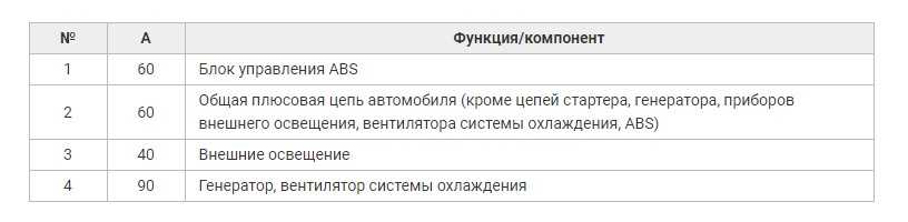 | № предохранителя(номинальный ток) | Наименование оборудования защищаемых электрических цепей |