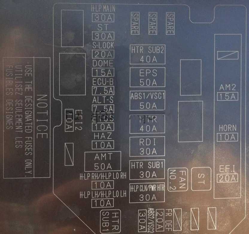 - 120A ALT – Система зарядки, Предохранители HTR SUB2″, “EPS”, “ABS1/VSC1”, “HTR”, “ABS2/VSC2”, “HTR SUB1”, “RDI”, “DEF”, “FR FOG”, “OBD2”, “D/L”, “POWER”, “RR DOOR”, “RL DOOR”, “STOP” and “AM1” fuses