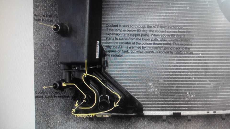 переводОхлаждающая жидкость всасывается через теплообменник АТФ, если температура ниже 80 град, температура охлаждающей жидкости из расширительного бачка (верхний путь), когда выше 80 градусов, если начинает поступать из нижней пути, который привлекает охлаждающей жидкости от радиатора в нижней (нижний путь ), это объясняет, расширительный бак, но когда тепло, охлаждается охлаждающей жидкости из радиатора