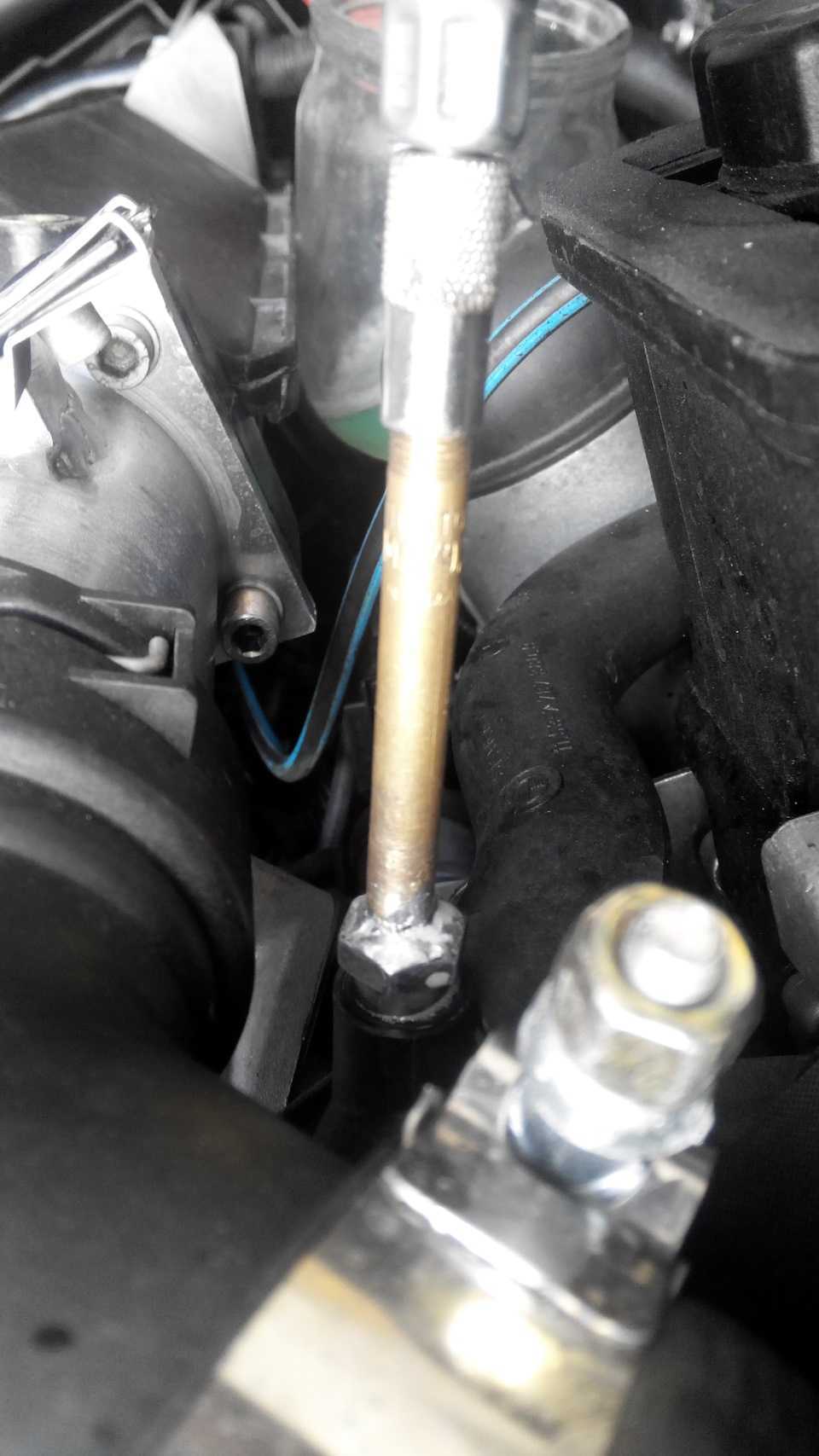 И вот сегодня я поехал в гараж разбираться, воздух там действительно был, хоть я и заливал по TISу, но все же расскажу где был косяк!Что бы проверить крышки радиатора я соорудил штуцер из старого вентиля от грузового колеса и винта для спуска воздуха из СО bmw. Сделал 2 штуки, в один качал воздух компрессором на втором мерил манометром давление, стравливания крышки радиатора. Как оказалось не зря проверил я крышки.Сливаем антифриз из бочка и радиатора.Вкручиваем мои изобретения)))