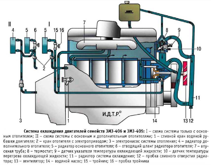 В систему включён термостат. Он направляет поток охлаждающей жидкости по большому, либо по малому кругу, в зависимости от температуры прогрева двигателя. Так же, при необходимости помпа 406 подаёт жидкость охлаждения в печку, обеспечивая тем самым тепло и комфорт в салоне автомобиля. В систему включён температурный датчик, постоянно указывающий температуру жидкости охлаждения. Он даёт возможность водителю, постоянно вести контроль за температурой ДВС.