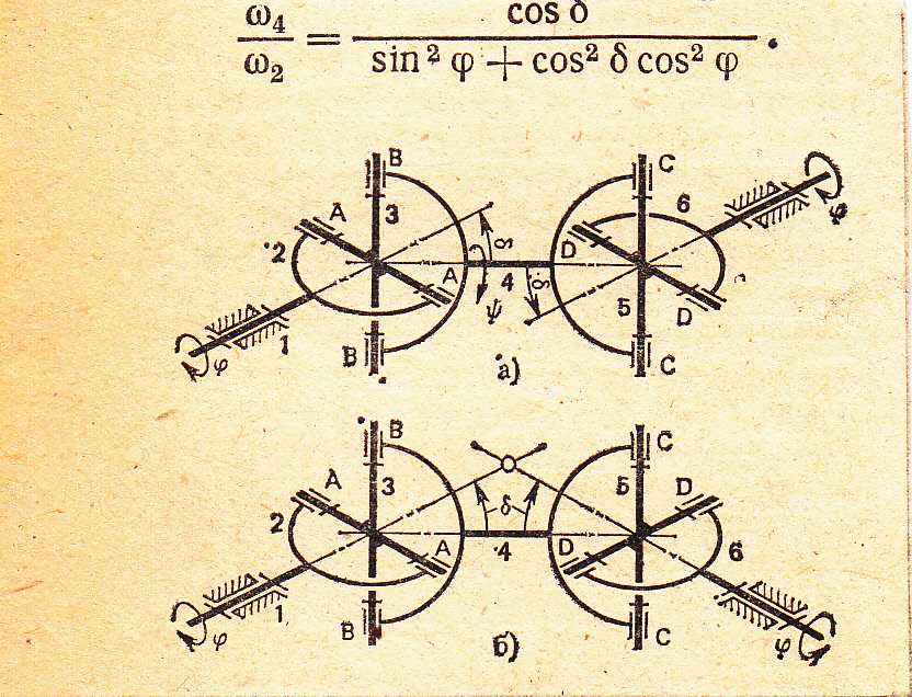 Жесткий карданный шарнир неравных угловых скоростей передает вращающий момент от одного вала к другому вследствие подвижного соединения жестких деталей. Он состоит из двух вилок — 3 и 5, в цилиндрические отверстия которых установлены на подшипниках концы А, Б, В и Г соединительного элемента — крестовины 4. Вилки жестко соединены с валами 1 и 2. Вилка 5 может поворачиваться относительно оси БГ крестовины и в то же время вместе с крестовиной поворачиваться относительно оси АВ, благодаря чему и обеспечивается возможность передачи вращения от одного вала к другому при меняющемся угле между ними.