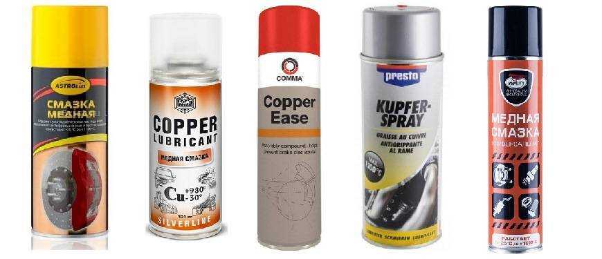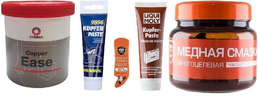 - медные пасты — HUSKEY 341 Copper Anti-Seize, LIQUI MOLY Kupfer-Paste, Mannol Kupfer-Paste Super-Hafteffekt, Marly Cooper Compound, Molykote Cu-7439 Plus Paste, Motip Koperspray, Permatex Copper Anti-Seize Lubricant, Pingo Kupfer-Paste, Valvoline Cooper Spray, Wurth SU 800;