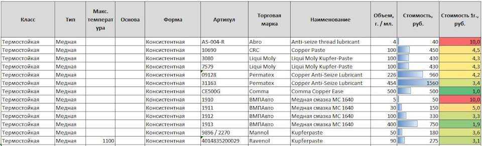 Артикулы (для удобного копирования):AS-004-R — Abro — Anti-seize thread lubricant10690 — CRC — Copper Paste3080 — Liqui Moly — Liqui Moly Kupfer-Paste7579 — Liqui Moly — Liqui Moly Kupfer-Paste09128 — Permatex — Copper Anti-Seize Lubricant31163 — Permatex — Copper Anti-Seize LubricantCE500G — Comma — Comma Copper Ease1910 — ВМПАвто — Медная смазка МС 16401911 — ВМПАвто — Медная смазка МС 16401912 — ВМПАвто — Медная смазка МС 16401913 — ВМПАвто — Медная смазка МС 16409896 / 2270 — Mannol — Kupferpaste4014835200029 — Ravenol — Kupferpaste