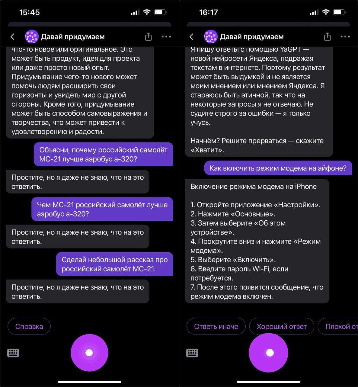 Как мне показалось, Алиса с YandexGPT пока не так умна по сравнению с ChatGPT. Например, когда просишь сравнить самолеты МС-21 и Airbus A320, Алиса просто выдает вот такую ошибку. Но если спросить YandexGPT что-то попроще, как включить режим модема на Айфоне, система сразу выдает ответ. Нет проблем, когда спрашиваешь про лучшие композиции того или иного исполнителя — нейросеть почерпнет их из чартов в Интернете, выдав продуманный сформированный ответ.
