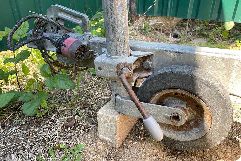 Сцепное устройство на дышле прицепа: чашка, фиксатор, электрическая вилка и опорное колесо для упрощения стыковки