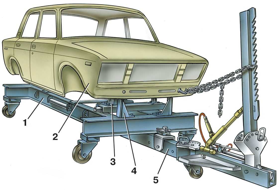 Приспособление для правки закрепляется на раме со стороны деформированной части кузова.