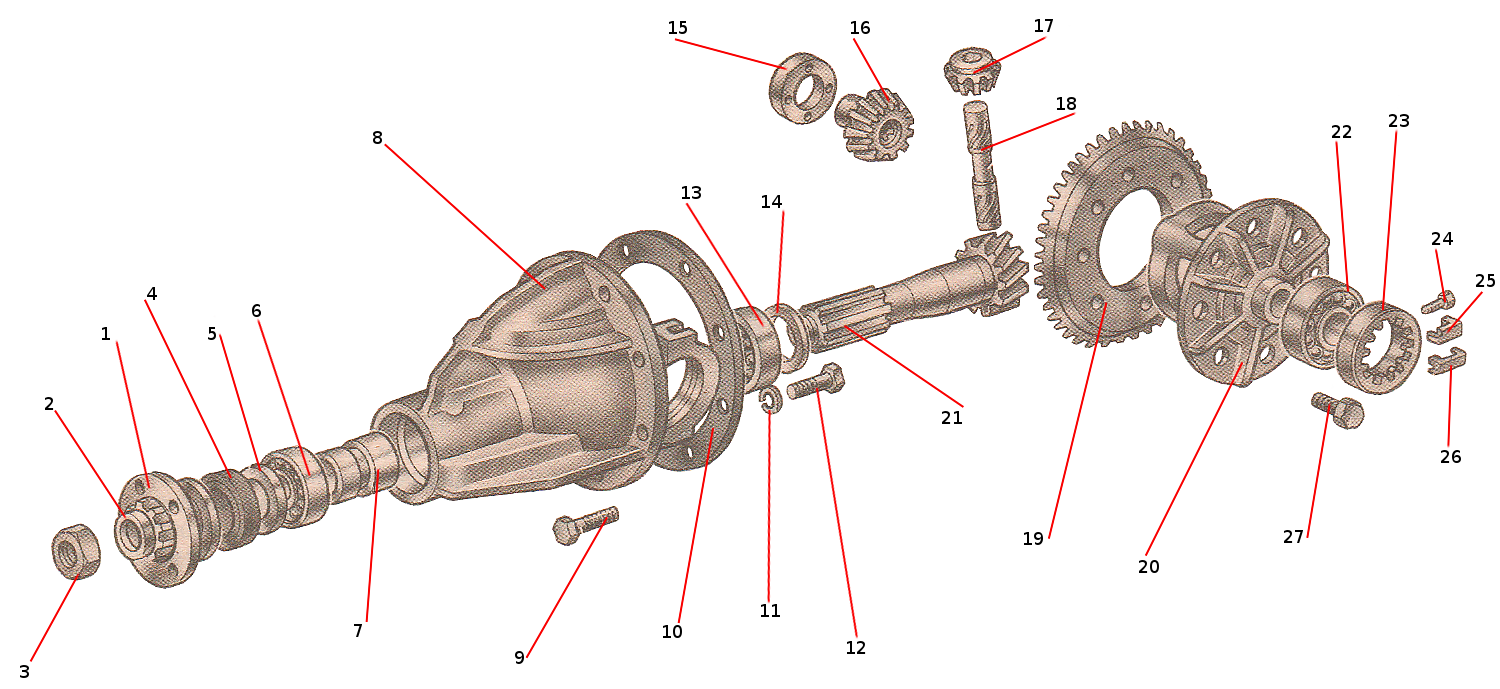 1. Фланец ведущей шестерни.2. Плоская шайба.3. Гайка крепления фланца ведущей шестерни.4. Сальник.5. Маслоотражатель.6. Передний подшипник.7. Распорная втулка.8. Картер редуктора.9. Болт крепления редуктора к балке заднего моста.10. Прокладка.11. Пружинная шайба.12. Болт крепления крышки.13. Задний подшипник.14. Регулировочное кольцо ведущей шестерни.15. Опорная шайба шестерни полуоси.16. Шестерня полуоси.17. Сателлит.18. Ось сателлита.19. Ведомая шестерня.20. Коробка дифференциала.21. Ведущая шестерня.22. Подшипник коробки дифференциала.23. Регулировочная гайка.24. Болт крепления стопорной пластины.25. Стопорная пластина.26. Стопорная пластина.27. Болт крепления ведомой шестерни к коробке дифференциала.