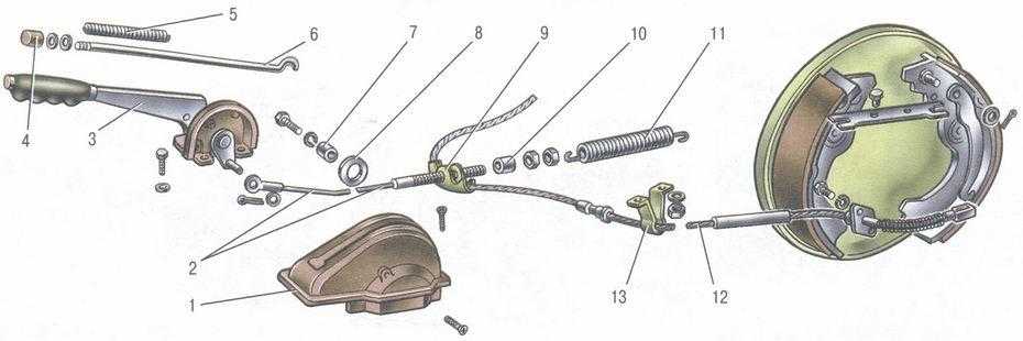 Привод ручного тормоза ВАЗ 2106: 1 — чехол; 2 — передний трос; 3 — рычаг; 4 — кнопка; 5 — пружина тяги; 6 — тяга защелки; 7 — втулка; 8 — ролик; 9 — направляющая заднего троса; 10 — распорная втулка; 11 — оттяжная пружина; 12 — задний трос; 13 — кронштейн заднего троса