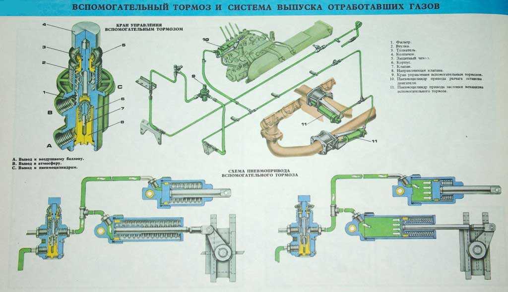 В грузовиках, где используется не гидравлический, а пневматический привод, предусмотрена вспомогательная схема (так называемый ретардер). Она включается в помощь основной для торможения на крутых спусках при максимальной загрузке, а также в прочих экстремальных ситуациях.