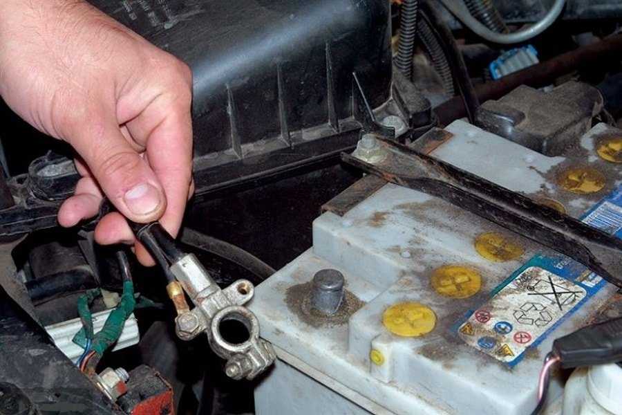 В первую очередь необходимо отсоединить минусовую клемму на аккумуляторе.
