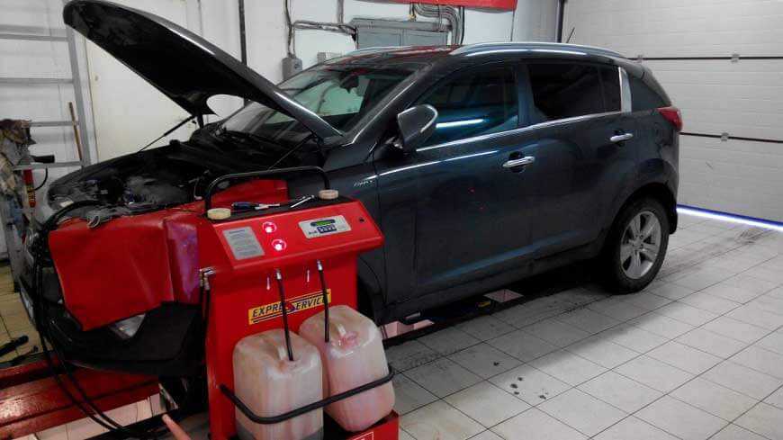 - Для полной замены необходимо специальное оборудование для того, чтобы из системы была выкачана вся жидкость, промыта система и залито новое.