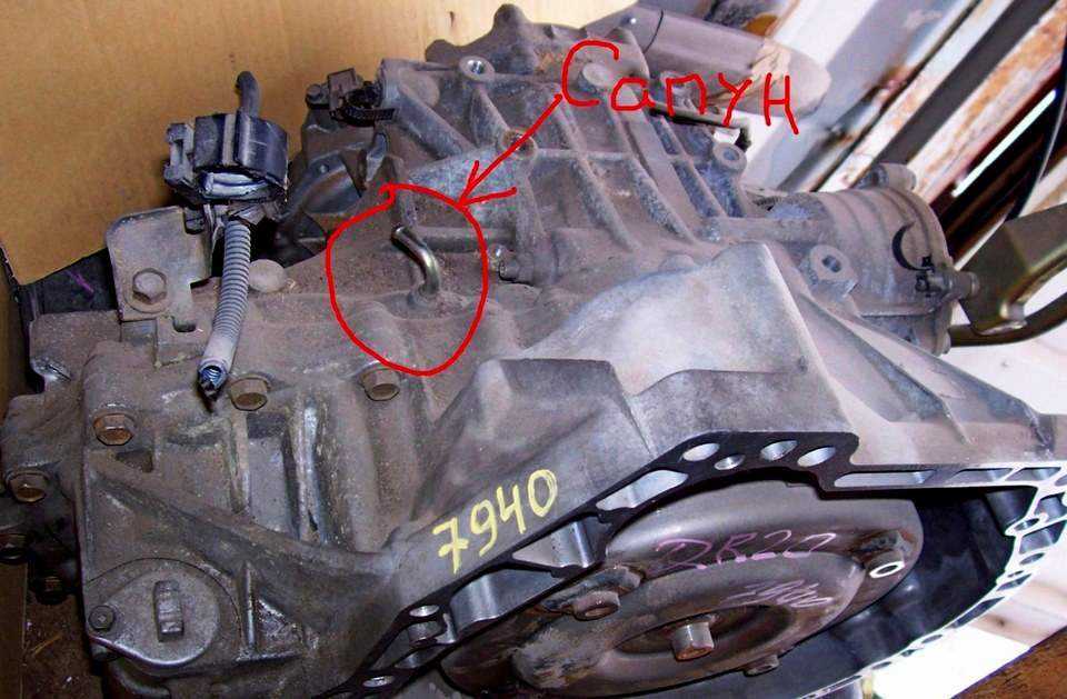 Сбоку на корпусе АКПП есть болт, глушащий контрольное отверстие. Это один из способов установки уровня в моделях, где нет щупа. Открутив его, большим шприцем через шланг подается ATF‐жидкость. Работа ведется снизу из смотровой ямы.