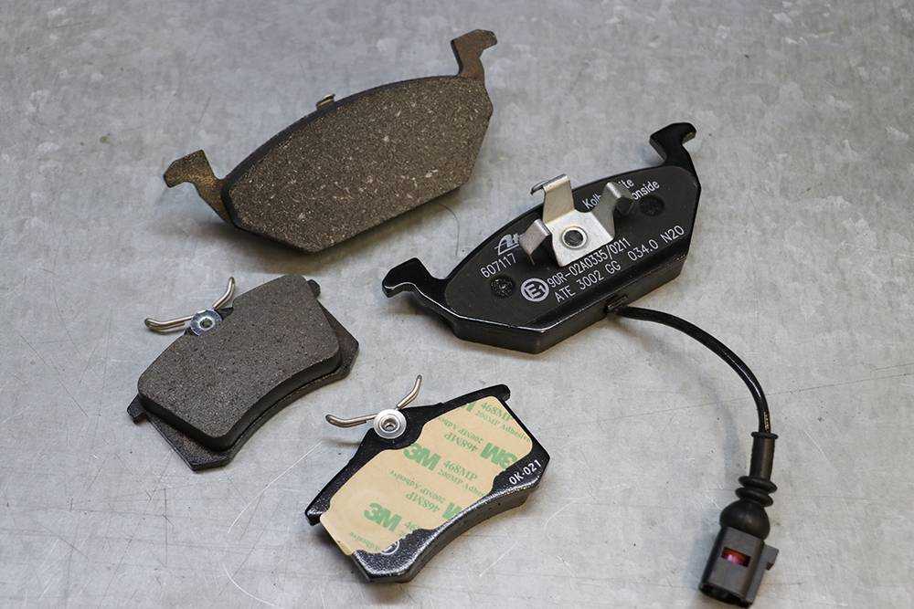 Колодки ATE для Шкоды Октавии A5. Те, что поменьше — на заднюю ось: противоскрипной пластины нет, есть слой клея, который помогает зафиксировать колодки на тормозном суппорте. Те, что побольше — на переднюю ось. Одна из колодок — с датчиком износа. Колодки такого типа чаще всего ставят на автомобили европейских автопроизводителей