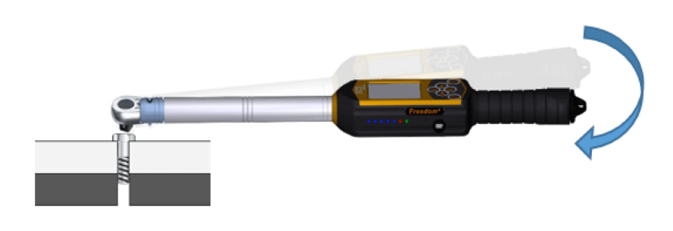 Для проведения этого испытания электронный динамометрический ключ должен быть оснащен датчиком крутящего момента и гироскопом для измерения угла, с алгоритмом автоматического распознавания первого шага и остаточного крутящего момента в обоих случаях, показанных выше.