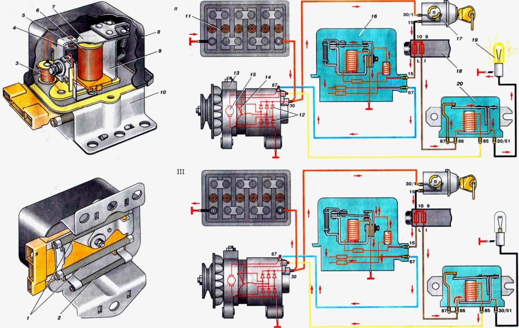 При включении зажигания плюс от замка идет к предохранителю № 10, а затем уже поступает на реле контрольной лампы заряда аккумуляторной батареи, потом идет к контакту и на вывод катушки. Второй вывод катушки взаимодействует с центральным выводом стартера, где соединяются все три обмотки. Если контакты реле замыкаются, то и контрольная лампа горит. При запуске двигателя генератор вырабатывает ток и на обмотках появляется переменное напряжение 7В. Через катушку реле проходит ток и якорь начинает притягиваться, при этом контакты размыкаются. Генератор № 15 через предохранитель № 9 пропускает ток. Аналогично через генератор напряжения щетки получает питание обмотка возбуждения.
