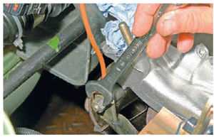 Ключом на «13» отворачиваем гайку верхнего крепления правого опорного кронштейна впускной трубы. Снимаем наконечник провода «массы» со шпильки впускной трубы.