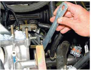 Работу проводим на смотровой канаве или эстакаде. Сливаем охлаждающую жидкость из двигателя (см. «Проверка уровня и замена охлаждающей жидкости»). Снимаем ресивер (см. «Снятие ресивера») и топливную рампу с форсунками (см. «Проверка форсунок, снятие топливной рампы и форсунок»). Отсоединяем колодку жгута проводов системы управления двигателем от колодки жгута проводов датчика концентрации кислорода (см. «Снятие управляющего датчика концентрации кислорода»).