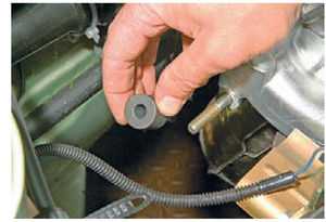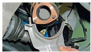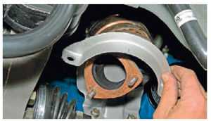 Отвернув три гайки крепления фланца трубы дополнительного глушителя к фланцу катколлектора, отсоединяем дополнительный глушитель от катколлектора (см. «Снятие дополнительного глушителя»).