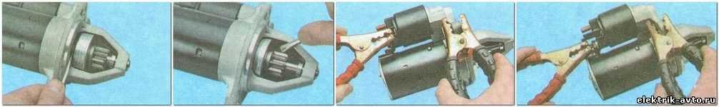 Для проверки общей работоспособности стартера понадобится аккумулятор и набор силовых проводов, обычно используемых для прикуривания (с зажимами типа «крокодил») при этом «минусовую» клемму аккумулятора соединяем с корпусом стартера, а «плюс» подключаем к управляющему выводу тягового реле. При нормальном состоянии тягового реле должен раздаться характерный щелчок, а муфта выдвинуться в переднее положение. При невыполнении указанных условий ремонт, скорее всего, ограничиться заменой тягового реле.