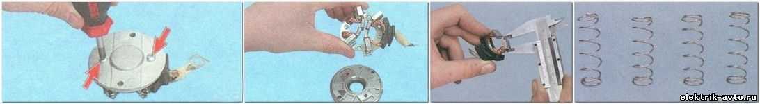 Для проверки состояния щеточного узла выворачиваем в крышке корпуса два винта и отсоединяем от нее щеточный узел. Последовательно отжимая фиксаторы извлекаем каждую щетку вместе с прижимной пружиной. Высота щеток должна быть не менее 4 мм (замер производится от края рабочей поверхности до «косички проводов), а пружины не должны быть слишком обжатыми и деформированными (дефектные элементы подлежат замене).