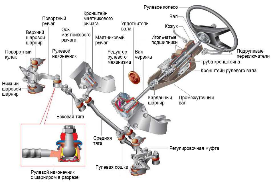 Конструкция привода зависит от используемого механизма. Так, если на авто используется «шестерня-рейка», то привод состоит всего лишь из двух тяг, соединенных с поворотным кулаком (роль которого выполняет амортизационная стойка) посредством шарового наконечника.