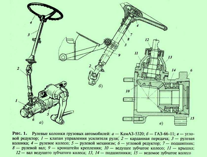 На грузовых автомобилях (рис. 1) рулевая колонка 3, установленная внутри кабины водителя, крепится средней частью к внутренней панели и переднему щитку кабины.