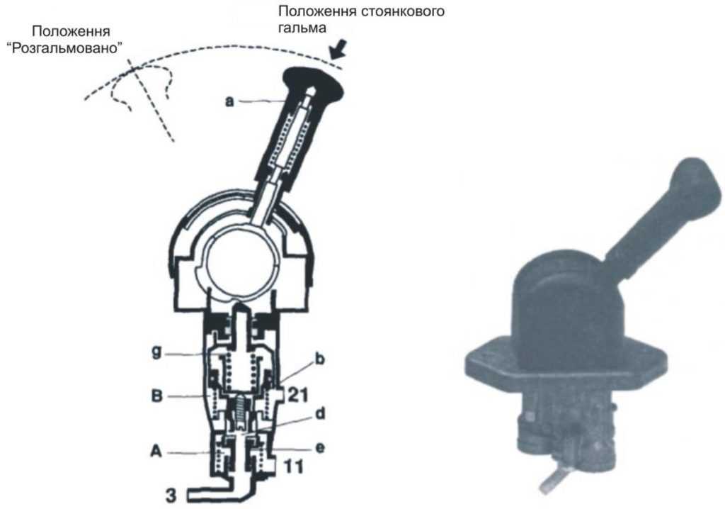 Кран тормозной ручной предназначен для управления пружинными энергоаккумуляторами привода стояночной тормозной системы. Рычаг крана расположен на панели приборов слева от водителя.