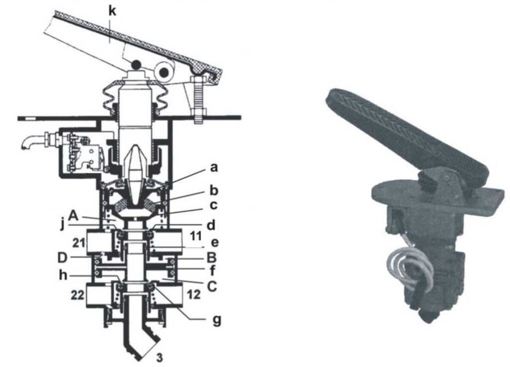 При дальнейшем нажатии на педаль (k) срабатывает также пневматическая тормозная система. Поршень (с) перемещается вниз под действием толкателя, расположенного в тарельчатой пружине (а), закрывает выпускное отверстие (d) и открывает впускной отверстие (j). Сжатый воздух на входе 11 проходит через камеру А и вывод 21 к подключенным далее пневмоапаратам рабочего тормозного контура 1. Одновременно сжатый воздух проходит через отверстие D в камеру В и нагружает поршень (f). Поршень перемещается вниз, закрывыет выпускное отверстие (h) и открывает впускной отверстие (g). Сжатый воздух подается от вывода 12 в камеру С и вывод 22 к подключенным далее пневмоаппаратам рабочего тормозного контура 2.