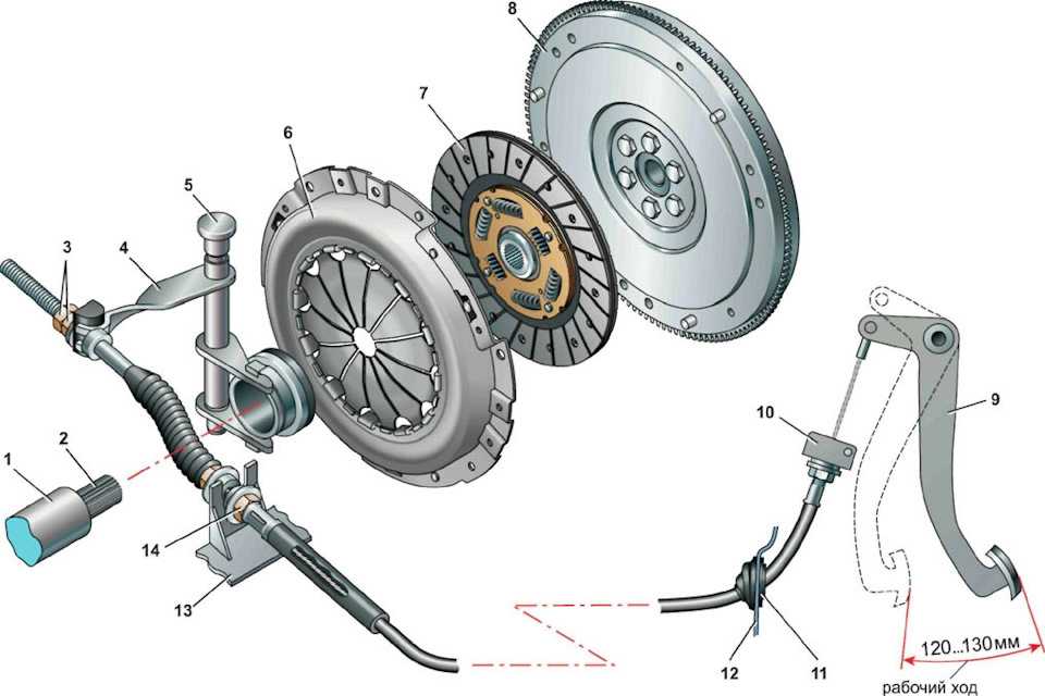 Его реализацию, в качестве примера, как один из возможных вариантов, можно увидеть на приведенном ниже рисунке. Этого достаточно для понимания устройства и работы привода сцепления, а также понимания его роли и значения в составе автомобиля.