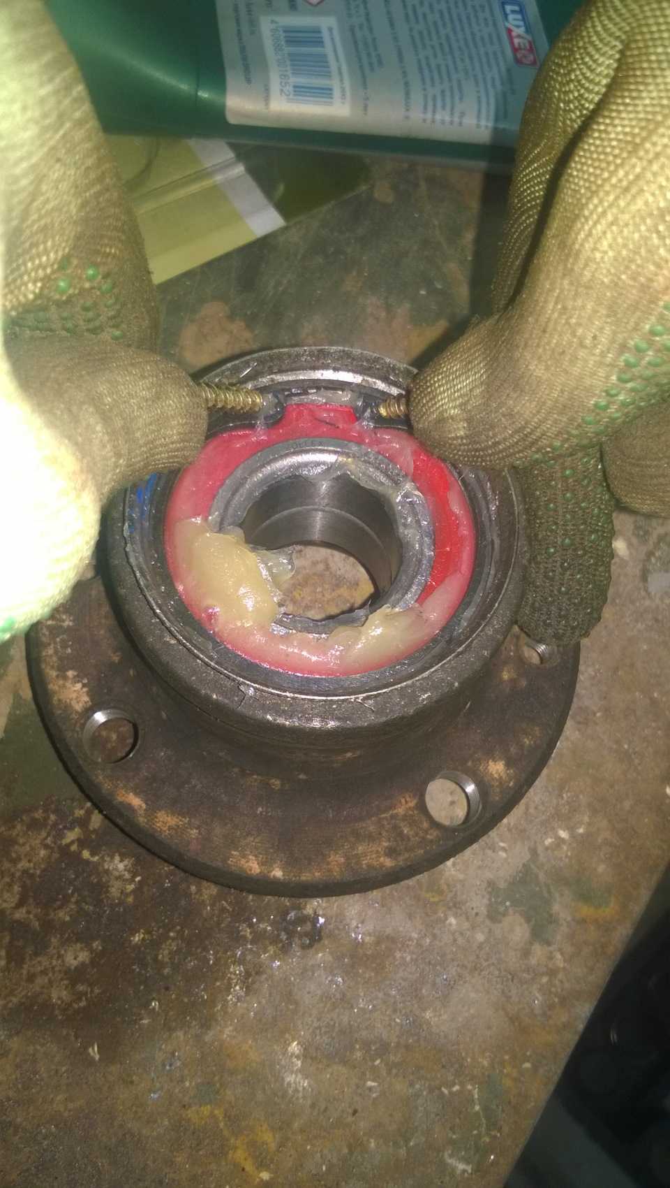 5. Снимаем стопорное кольцо и выпресовываем старый подшипникдля снятия этого стопорного кольца есть специальные щипцы. у кого-то. у нас же было 2 самореза и присоединившийся парень из соседнего гаража))а, да, еще там есть металлический пыльник, который выпал сам собой.далее настало время выпресовки. мы то думали, что на гайке наши мучения кончатся… наивные))первое до чего догадались — поставить ступицу на кирпичики и бить через головку кувалдой. но это не дало нужного результата. подшипник сидел как влитой, а кирпичи раскрошились.после мы вооружились тисками и промышленным феном.минут 10-15 равномерной прогревки ступицы и, установив на тиски, все той же кувалдой и головкой побольше подшипник выл выбит! победа!