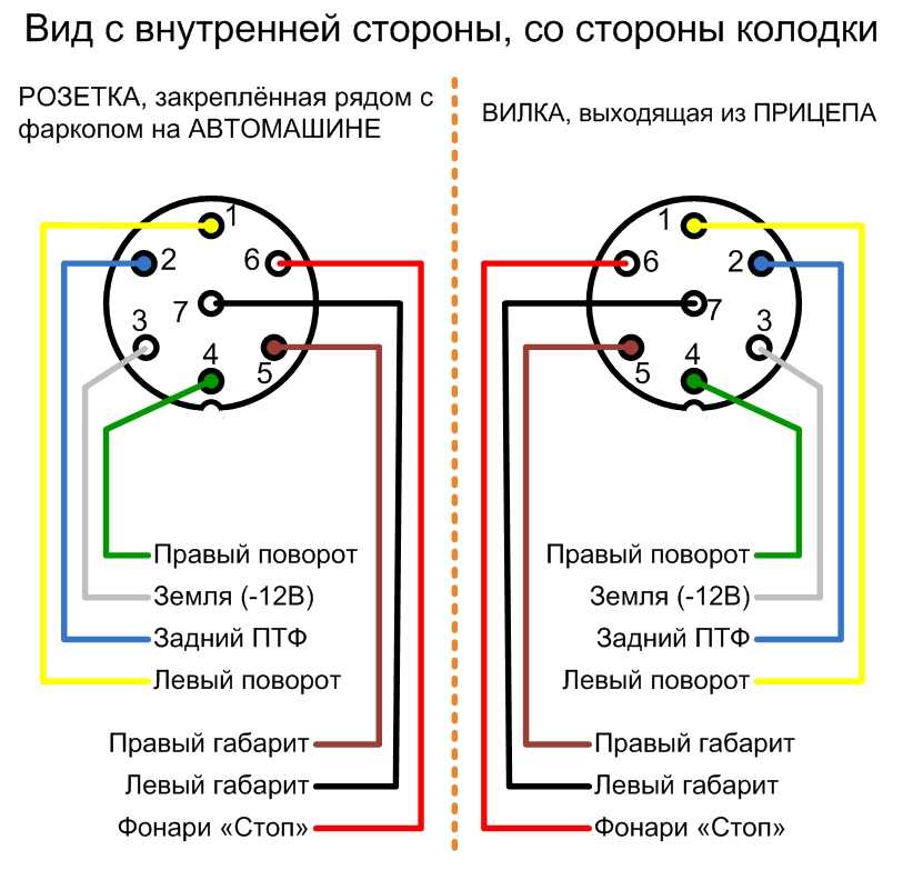 Закрепленная болтами на кронштейне, розетка подключается к основной проводке. При подключении нужно смотреть на цвета проводов согласно схемы. Подключать нужно в стандартный разъем, который может быть 7-жильным и 13-жильным (только на иностранных авто).