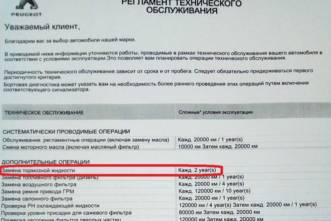 Фрагмент технического регламента Peugeot 3008, где описана периодичность смены тормозной жидкости