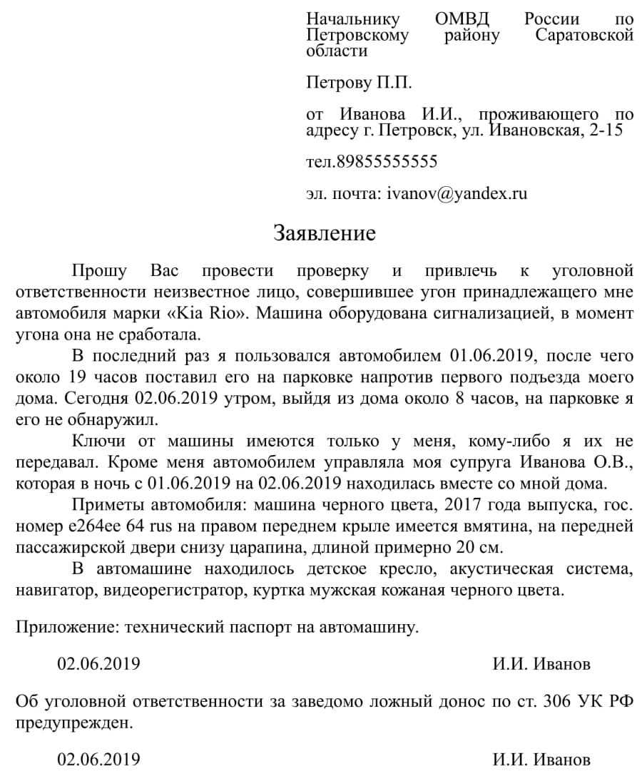 Внимание! В заявлении рекомендуется указать, что машина не передавалась никому в добровольном порядке. Это дополнительно укажет на факт угона, и полиция с меньшей вероятностью откажет в возбуждении дела